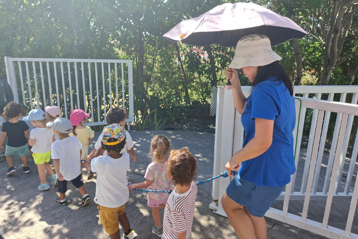 Les petits de la maternelle marchent main dans la main et reliés par une cordelette en direction du refuge tsunami.