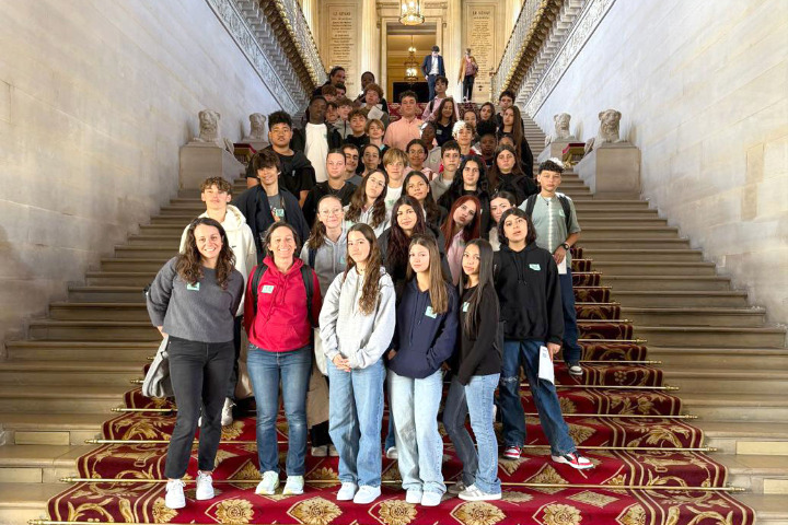Les collégiens de Mireille Choisy sur les marches du Sénat, à Paris.