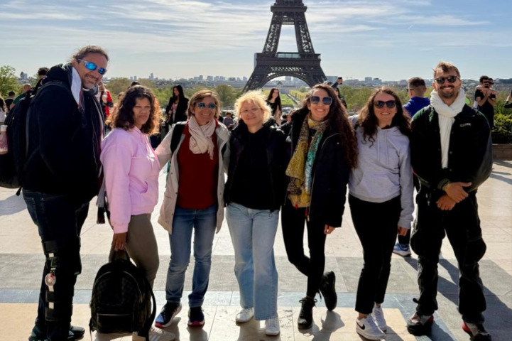 Les adultes encadrants du voyage scolaire posent devant la Tour Eiffel.